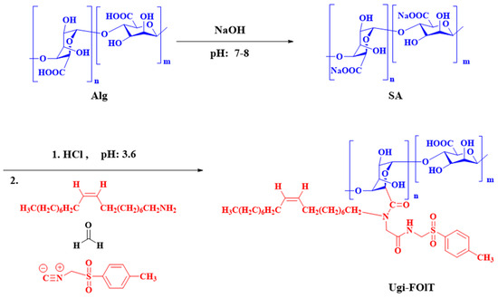 - Liu, Z.; Chen, X.; Wen, Y.; Bao, C.; Liu, C.; Cao, S.; Yan, H.; Lin, Q. Chemical modification of alginate with tosylmethyl isocyanide, propionaldehyde and octylamine via the Ugi reaction for hydrophobic drug delivery. Polym. Bull. 2021, 79, 7809–7826. [Google Scholar] [CrossRef]