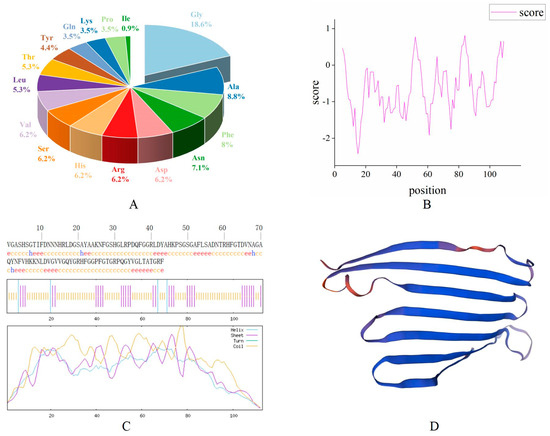 Bioinformatics analysis of the antimicrobial peptide MaltAtt-1 protein: (A) amino acid composition of MaltAtt-1; (B) hydrophilic/hydrophobic analysis of MaltAtt-1; (C) secondary structure prediction of MaltAtt-1; (D) tertiary structure prediction of MaltAtt-1.