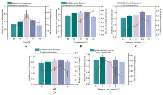In order to achieve a high level of production of the recombinant protein, shake bottle induction conditions were optimized to explore the expression levels of recombinant protein under different induction times (24 h, 48 h, 72 h, 96 h, and 120 h), induction temperatures (24 °C, 26 °C, 28 °C, 30 °C, and 32 °C), initial pH values (4.0, 5.0, 6.0, 7.0, and 8.0), methanol volume fractions (0.5%, 1.0%, 1.5%, 2.0%, and 2.5% v/v), and initial glycerol concentrations (0.5%, 1%, 3%, 5%, and 7% v/v). After induction, the supernatant was collected to explore the influence of various factors on the expression level of the recombinant protein. The protein concentration and inhibition circle diameter were used as indicators. Each experiment were performed in triplicate.