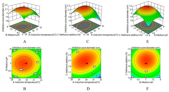 Response surfaces and corresponding contour lines for inhibition zone diameter: (A) response surface of the interaction effect between the induction temperature and medium pH on inhibition zone diameter; (B) contour line of the interaction effect between the induction temperature and medium pH on inhibition zone diameter; (C) response surface of the interaction effect between the induction temperature and methanol addition on inhibition zone diameter; (D) contour line of the interaction effect between the induction temperature and methanol addition on inhibition zone diameter; (E) response surface of the interaction effect between the medium pH and methanol addition on inhibition zone diameter; and (F) contour line of the interaction effect between the medium pH and methanol addition on inhibition zone diameter.