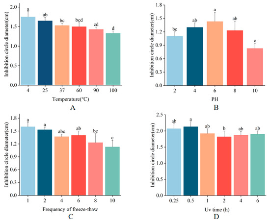 To investigate the freeze-thaw stability of recombinant protein fermentation supernatant, an antibacterial activity test was performed. The fermentation broth was repeatedly frozen and thawed at −20 °C either 1, 2, 4, 6, 8, or 10 times. Then, its activity was determined through an antibacterial zone test. Untreated antimicrobial peptides were used as the control group. Each experiment was performed in triplicate.