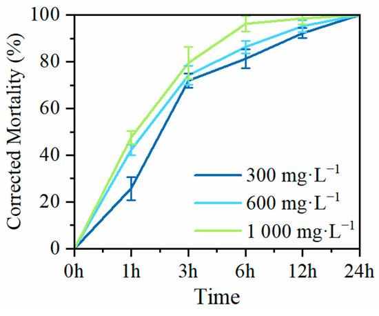 To investigate the nematocidal activity of MaltAtt-1, produced by secretion expression in K. phaffii GS115, against PWN (B. xylophilus), adult nematodes were exposed to purified MaltAtt-1 at different concentrations to determine corrected mortality rates. Exposure to 300 mg·L−1 of MaltAtt-1 resulted in a corrected mortality of over 70% (71.94%) within 3 h. At a concentration of 1000 mg·L−1, corrected mortality exceed 90% (96.33%) within 6 h. After 24 h of treatment with MaltAtt-1, all nematodes were deceased regardless of the concentration used (Figure 6).