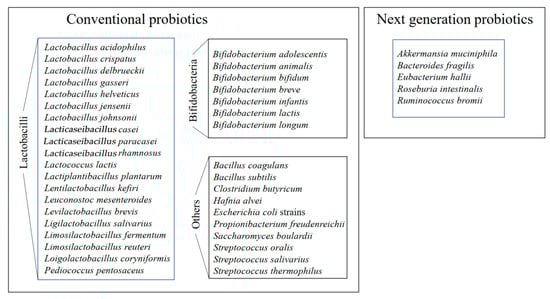 Probiotic bacteria have been shown to affect human health in a positive way via diverse mechanisms, for example, by enhancing the uptake of dietary nutrients, improving digestion, altering the gastric pH, improving the epithelial barrier function [,], protecting against physiological stress, strengthening the protection and reaction against pathogens, and regulating the immune response [,,,,]. For example, lactic acid bacteria, with their probiotic properties, can maintain gut homeostasis by regulating inflammatory and immune reactions. Many probiotics can function as microbial barriers against pathogenic bacteria via competitive binding and/or production of inhibitory compounds that decrease the proliferation of pathogens []. For example, the production of protective proteinaceous compounds bacteriocins in vivo in a mice model was registered during anti-infective activity of Ligilactobacillus salivarius against pathogen Listeria monocytogenes [], and the production of lactic acid was demonstrated during antibacterial and inhibition functions of six lactobacilli against invasion of Salmonella enterica into human enterocyte-like cells []. Moreover, promising potential candidates of next-generation probiotics such as Akkermansia muciniphila, Bacteroides fragilis, Roseburia intestinalis, and Eubacterium hallii have been studied for their beneficial properties for human health [,,,,,]. The list of probiotic bacteria and next-generation probiotics that have the potential for health prevention and disease treatment was compiled in Figure 1.