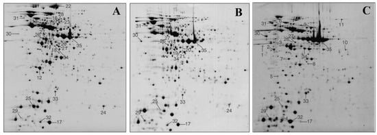 Representative 2-DE gel patterns and the differences in the expression of the proteins produced by three Lactobacillus plantarum strains. (A) L. plantarum 299v; (B) L. plantarum CECT 4185; (C) L. plantarum WHE 92. The pH range was 4–7, the gels were stained by Coomassie blue, and 75 μg of total protein were loaded. In total, 35 protein spots (marked in the gels) that exhibited differential intensities between compared gels were excised from the gels, and the proteins in the spots were identified by mass spectrometry. The figure was adapted from ref. [] with permission.