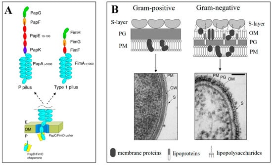 Pili and S-layers of bacterial cells. (A) Two types of multisubunit structures of Escherichia coli pili, P pilus, and type 1 pilus. P pilus and type 1 pilus tips contain PapG and FimH adhesin, respectively, that enable the attachment of bacteria to the receptors of epithelial cells of kidney (PapG) and bladder (FimH). PapG is connected through PapF adaptor subunit to fibrillum created by PapE homopolymer (10–100 copies) that is further attached to the pilus rod via PapK adapter subunit. In type 1 pilus, FimH is connected to one copy of FimG subunit and attached to the pilus rod via one copy of FimF subunit. The pilus rod includes a homopolymer of more than 1000 copies of PapA or FimA in P pilus and type 1 pilus, respectively. The bottom part of panel (A) shows schematically the chaperone/usher (CU) pathway that is responsible for pili assembly. CU pathway includes the noncovalent polymerization of pilus subunits bound to periplasmic chaperones (PapD and FimC for P pili and type 1 pili, respectively) at outer membrane (OM) assembly platform called usher. The usher catalyzes polymerization and enables the translocation of folded subunits across OM []; E—extracellular space; P—periplasmic space. (B) Schematic illustration and electron micrographs of cell envelope structures for Gram-positive and Gram-negative bacteria, both possessing cell-surface layer (S-layer). PG—peptidoglycan layer; PM—plasma membrane; CW—Gram-positive cell wall (usually, peptidoglycans compose the rigid wall); OM—outer membrane; S—S-layer. Figure 3A was adapted from ref. [], and Figure 3B was adapted from ref. [] with permission.