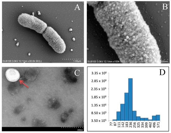 Transmission electron microscopy of L. salivarius SNK-6 strain with extracellular vesicles (EVs). (A) L. salivarius SNK-6 is a short, rod-shape bacterium arranged in pairs that releases nanosized EVs from the cell surface; (B) the magnification of the part of a bacterium; (C) the magnification of purified EV (pointing to by red arrow) that is spherical and enclosed by membrane; (D) the size distribution of the EVs that were released by L. salivarius SNK-6 and carried most of the cargo; EV diameters were from 111 to 256 nm, with the majority of EVs having diameters of 236 nm. This figure was adapted from ref. [].