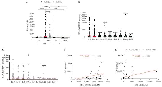 2.1. In AD Patients, HDM-Induced CLA+/CLA T-Cell IL-9 Levels Are Higher Than Th2, Th1, and Th17-Related Cytokines and Correlate with Plasma IgE
