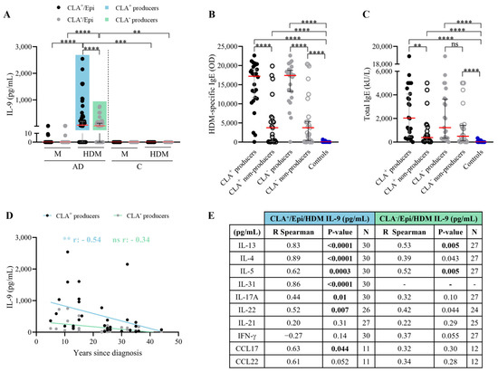 IL-9 was detected in 58% and 52% of HDM-stimulated CLA+ and CLA cocultures, respectively (Figure 3A). AD patients were segregated into IL-9 producers and non-producers. IL-9-producing (either CLA+/CLA) AD patients exhibited the highest specific and total IgE levels (Figure 3B,C). Although non-producers had lower IgE levels, their degree of allergen sensitization and allergic status was higher than controls. Moreover, IL-9 response to HDM tended to correlate with HDM-specific IgE levels in IL-9 producers, specifically among the CLA+ subset (Table S4). Additionally, HDM-induced CLA+ T cell IL-9 production indirectly correlated with AD duration (r = −0.54, p = 0.002) (Figure 3D). No further associations were found between IL-9 and AD clinical characteristics (Table S2).