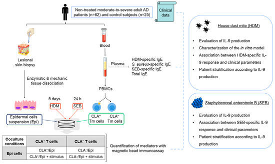 Thus far, in humans, IL-9 production by T cells has been mainly studied via polyclonally activated PBMCs and intracellular flow cytometry analysis [7,8,12,13,14,24,25,26]. However, whether IL-9 can be induced by pathological triggers associated with AD, such as house dust mite (HDM) allergens or staphylococcal enterotoxin B (SEB), specifically in CLA+/CLA memory T cells, remains unexplored. Additionally, the relationship between this IL-9 production and the clinical status of the patients has not been characterized.