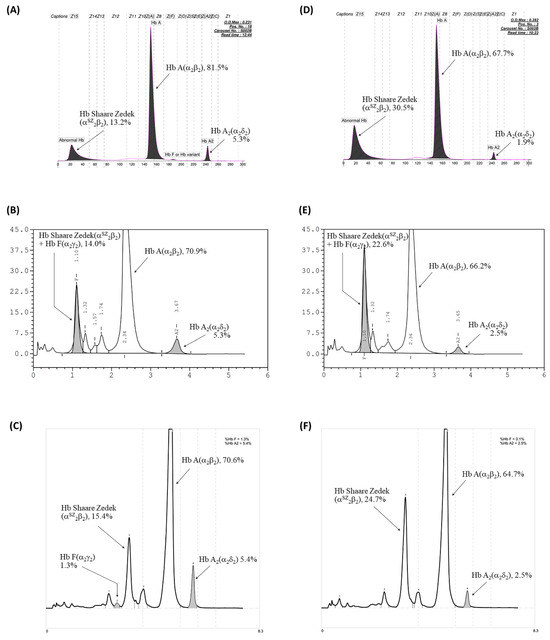 Hb analysis of the proband with Hb Shaare Zedek (Hb SZ) co-inherited with β0-thalassemia (A–C) and his father with heterozygous Hb SZ (D–F). (A,D) Analysis using the high-performance liquid chromatography (HPLC) VARIANT II system. (B,E) Analysis from the Premier Resolution HPLC system. (C,F) Analysis from the capillary electrophoresis (CE) system.
