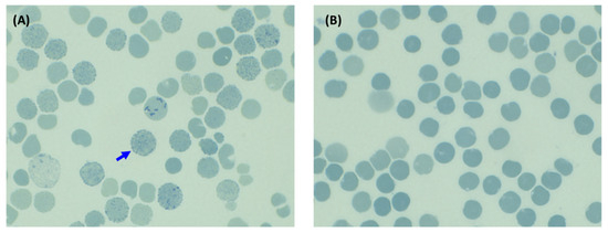 Red blood cell inclusion bodies induced after incubation with 1% brilliant cresyl blue for 1 h. The blue arrow points to red blood cells containing spherical inclusion bodies stained blue. (A) A positive control sample from a patient with HbH disease. (B) The proband sample.