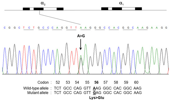 Direct sequencing of the α- and β-globin genes identified an A to G mutation at the first nucleotide of codon 56 in the α2-globin gene of the proband and three other family members with the unidentified hemoglobin. No abnormalities were observed in the α1-globin gene (Figure 3). This A to G mutation, which substitutes lysine for glutamic acid, is characteristic of Hb SZ (HBA2:c.169A>G). It has been previously reported in Israeli and Chinese populations, but not in Thai individuals [10,12]. Additionally, an A to T substitution at codon 17 in the β-globin gene, the most common β0-thalassemia mutation, was identified in both the proband and his mother. DNA analysis confirmed that the proband carries both the Hb SZ and β0-thalassemia mutations in a heterozygous state, indicating a previously unreported complex thalassemia syndrome. The father harbored only the Hb SZ (simple heterozygous) mutation, while the mother carried the β0-thalassemia mutation. Therefore, the proband inherited the Hb SZ mutation from the father and the β0-thalassemia mutation from the mother.