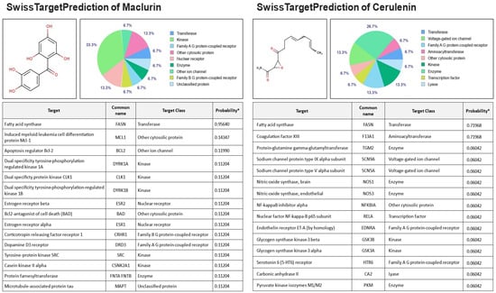 SwissDock (ChEMBL version 23) is an open server provided since 2014, designed as a web tool to predict potential protein targets for small molecules. To predict protein targets interacting with the structure of maclurin, we utilized the Swiss Dock docking software (www.swisstargetprediction.ch, accessed on 20 December 2019) following established methods []. The structural information of maclurin (CID: 68213) and cerulenin (CID: 5282054) was obtained from PubChem. The target prediction was performed using the homo sapiens database.