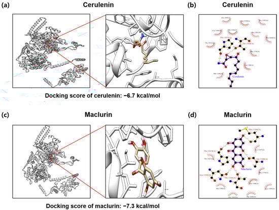 Protein–ligand docking simulations were conducted to predict the binding affinity of maclurin and cerulenin with FAS. Our analysis focused on comparing the docking scores to assess the binding strength of maclurin at the known binding site for the FAS inhibitor cerulenin. The predicted binding affinity between FAS and cerulenin is −6.7 kcal/mol (Figure 2a), whereas maclurin exhibits a binding affinity of −7.3 kcal/mol (Figure 2c), signifying a greater affinity compared to cerulenin. The analysis of interactions between the amino acid residues of FAS protein and its ligands utilized the PDBsum database. According to structural predictions, cerulenin forms two hydrogen bonds (Pro 1419, Thr 1544) and involves 11 non-ligand residues in hydrophobic contacts (Gly 1645, Asn 1549, His 1542, Cys 1305, Phe 1646, His 1583, Phe 1644, Pro 1421, Phe 1376, Ala 1348, Met 1346) (Figure 2b). Maclurin forms five hydrogen bonds (Ala 1348, Pro 1419, Met 1346, Thr 1544, Asn 1549) and involves eight non-ligand residues in hydrophobic contacts (Pro 1421, Lys 1347, Phe 1376, Thr 1546, Ala 1548, His 1542, Phe 1646, Cys 1305), suggesting a potential contribution to binding with FAS (Figure 2d).