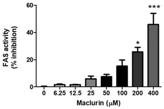 Due to the potential inhibitory activity of maclurin against FAS, as suggested by in silico analysis, we extracted crude enzyme fractions from fully differentiated adipocytes, and FAS-inhibitory effects were tested using FAS-related substrates. As depicted in Figure 3, when FAS was treated with various concentrations of maclurin (0–400 μM), we observed a concentration-dependent decrease in activity, confirming its potential for inhibiting FAS.