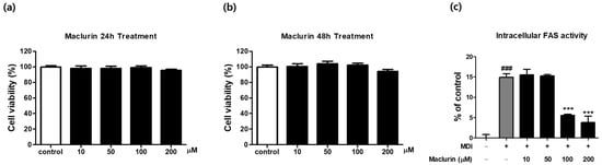 Cell viability was measured in 3T3-L1 preadipocytes treated with various concentrations (10–200 μM) of maclurin for (a) 24 h (n = 4–8/group) and (b) 48 h (n = 4–8/group). The effect of maclurin on FAS inhibition was assessed by measuring intracellular FAS activity (n = 3–4/group) in differentiated 3T3-L1 preadipocytes treated with (c) various concentrations of maclurin (10–200 μM). Results are presented as mean ± SEM. Significance levels are indicated as ### p < 0.001 compared to the untreated control group, and *** p < 0.001 compared to the MDI-treated group.