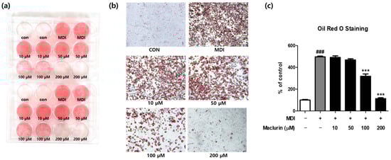 Fat accumulation in 3T3-L1 cells was evaluated using Oil Red staining. Cells were divided into control, MDI, and different maclurin concentration groups (10, 50, 100, 200 μM). Oil Red staining was conducted upon full cell differentiation. Briefly, fully differentiated cells were fixed using 10% neutral buffered formalin (BIOSESANG, Yongin, Republic of Korea), followed by rinsing with 60% isopropyl alcohol (B&J, Clayton, NC, USA), and subsequently stained with a 60% Oil Red O working solution (Sigma, Saint Louis, MO, USA). After rinsing with distilled water, the cells were observed under a microscope and treated with 100% isopropyl alcohol for Oil Red O extraction. The resulting solution was then transferred to a 96-well plate and measured at 500 nm to assess optical density.