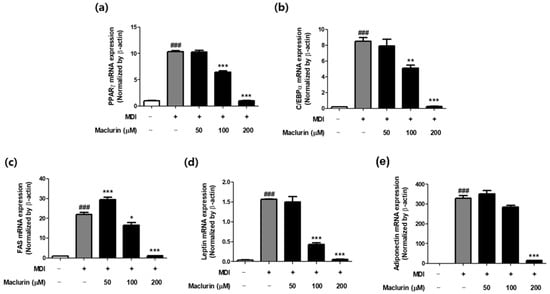 3T3-L1 adipocytes were treated with maclurin (50–200 μM) and harvested 8 days after differentiation initiation to determine the mRNA expression levels of (a) PPARγ, (b) C/EBPα, (c) FAS, (d) leptin, and (e) adiponectin. Results are presented as mean ± SEM. Significance levels are indicated as ### p < 0.001 compared to the untreated control group, and * p < 0.05, ** p < 0.01, *** p < 0.001 compared to the MDI-treated group.