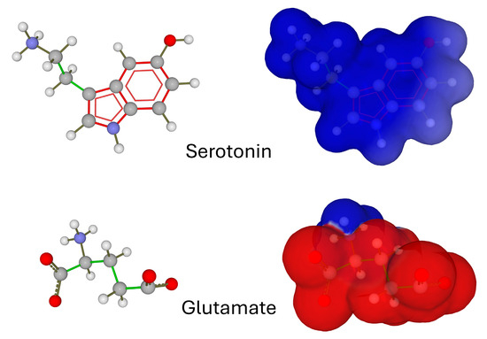 The electrostatic surface potential is a largely underestimated parameter of neurotransmitter activity [5,6]. To illustrate this point, we cannot find a better example than comparing this property for serotonin and glutamate (Figure 1). These two neurotransmitters have opposite electrical charges at a physiological pH, due to the presence of ionizable groups: the amine group for serotonin [7], the amine group and two carboxylate groups for glutamate [8]. The net electrical charge of these neurotransmitters in the synaptic cleft is, therefore, positive for serotonin and negative for glutamate. This greatly affects the electrostatic surface potential of the two molecules. Thus, serotonin has globally positive potential, while that of glutamate is highly negative (Figure 1).
