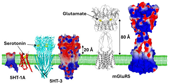 Membrane topology of serotonin and glutamate receptors. These structures were retrieved from PDB files 7e2y (5HT-1A) [26], 6dg7 (5HT-3) [27], and 6n51 (mGluR5) [28]. The neurotransmitters bound to the receptors are represented as yellow spheres. Each receptor is represented as ribbons to locate the transmembrane domains (red for 5HT-1A, cyan for 5HT-3, grey for mGluR5) and in surface rendition of the electrostatic potential (electronegative zones in red, electropositive in blue, neutral in white). The distance between the neurotransmitter binding site and the surface of the lipid bilayer is indicated beside black arrows.