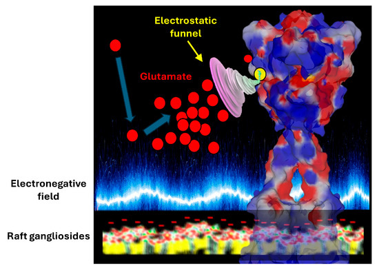 But it is not enough for a glutamate receptor to position the binding site of its neurotransmitter far from the post-synaptic membrane. It is necessary to attract glutamate towards its binding site in order to optimize the chances of stimulation and, therefore, to trigger synaptic transmission. Here again, it is an electrostatic mechanism that comes into play. In fact, glutamate is attracted towards its interaction site by an electrostatic funnel that directs the glutamate in the right direction. This electrostatic funnel has cationic walls that are well adapted to the transfer of glutamate from the synaptic space to the inside of the receptor. A similar mechanism has previously been demonstrated for the GABA receptor, a zwitterionic neurotransmitter also influenced by electric fields. In this case, the binding pathway of the neurotransmitter is driven by long-range electrostatic interactions, whereby the electrostatic field acts as a funnel that sweeps the GABA molecules towards the binding site, at which point more specific atomic interactions take over [33].