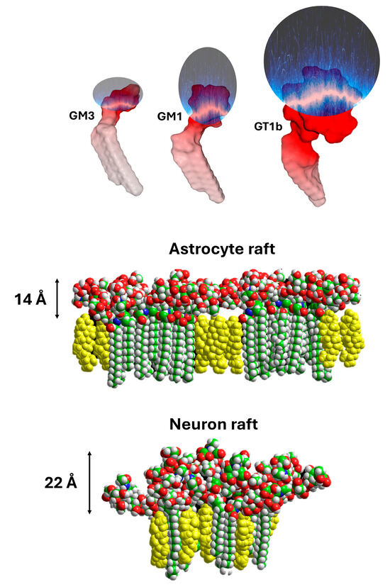 Even schematically, a synapse cannot be described by considering only the couple formed by the pre- and post-synaptic neurons. A third partner, fundamental for the balance of the system, intervenes, the astrocyte [37,38]. It is by combining the electric fields of these three cells that we understand how glutamate is first expelled from the synaptic space, then recycled. First, the membrane of the pre-synaptic neuron is itself enriched with gangliosides [39], which gives it a negative electrostatic surface potential. Glutamate cannot, therefore, return directly to the source of emission, the post-synaptic neuron. Subject to the dual influence of the electric fields of the pre- and post-synaptic neurons, it is naturally directed towards the least electronegative site present in the environment of the synapse. This site is none other than the plasma membrane of the astrocyte. Indeed, astrocytes also express gangliosides, but almost exclusively GM3 [40]. The chemical structure of GM3, which contains only two sugars and one sialic acid, is much smaller compared to those of the four main neuronal gangliosides, i.e., GM1, GD1a, GD1b, and GT1b [11]. Thus, one can perfectly differentiate a “neuronal raft” from an “astrocytic raft” (Figure 5). An estimation of the impact of the number of sialic acid units in gangliosides on the electrical potential has been given by Beitinger et al., who measured the surface potential (ΔV) of packed ganglioside monolayers: GMI = −17 mV, GT1b = −39 mV at a surface pressure π = 30 mN/m [36]. These negative values are in agreement with the electrostatic properties of ganglioside monolayers, as detailed by Maggio’s laboratory [41].