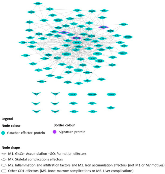 Graphical representation of the GD1 protein network, including skeletal complication effectors and their interactions with the selected protein effectors, as well as the most promising biomarker candidates and their interactions. The image presents directional link information between proteins, including all available relationships (links, gray color) between proteins (nodes, blue color) from a regularly updated in-house database drawn from public sources. The shape of the nodes indicates the GD1 motif to which the depicted proteins belong, and the purple border indicates the proteins belonging to the GD1 protein expression signature. GD1: type 1 Gaucher disease. GlcCer: Glucosylceramide. GCs: Gaucher Cells. M#: the number of identified pathophysiological processes or motifs involved in GD1.