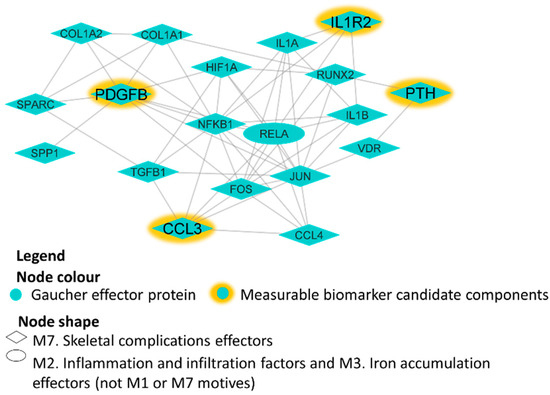 Of the 18 biomarker candidates, 4 were composed of elements all suitable for laboratory plasma measurements (Table 4): IL1R2, PDGFB, CCL3/MIP-1α and PTH. These four proteins, in addition to being GD1 protein effectors, are highly connected to the molecular characterization of GD1 (Figure 2).