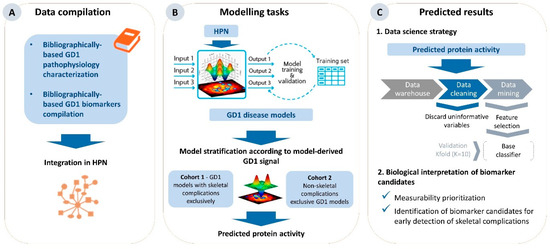 Workflow for the identification of potential biomarker candidates for GD1-related skeletal complications. This process involves three steps: (A) data compilation for molecular characterization of GD1 generation to develop the HPN; (B) modeling to generate GD1 mathematical models using a systems biology-based TPMS approach; and (C) data analyses employing model outputs, which were applied to the protein activity inferred from the mathematical models to classify and identify potential biomarker candidates. GD1: Type 1 Gaucher disease; HPN: human protein network; TPMS: Therapeutic Performance Mapping System.