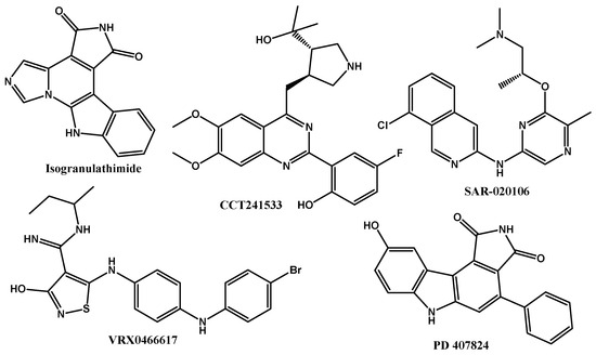 Checkpoint kinases 1 and 2 (CHK1 and CHK2) have great relevance as pharmacological targets, mainly associated with cancer. Their activity is due to being directly associated with a response of cancer cells to DNA damage; so, selective inhibitors are mainly sought against those kinases [1,2,3]. CHK1 inhibitors (Figure 1) have been directly associated with therapies coupled with DNA damage since CHK1 mediates the DNA repairing process by genes RAD51, FANCE, and the kinase enzyme system DNA-PK, as well as the control of replication by checkpoints Intra-S and G2/M. On the other hand, CHK2 is associated with DNA repair via BRCA1 and cell cycle control via G2/M and G1/S [4,5,6,7,8]. Therefore, the inhibition of CHK1 and CHK2 becomes of interest either as an adjuvant for chemotherapy treatments or in looking for compounds that have a cytotoxic effect on cancer cells, inhibiting their survival pathways.