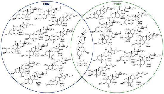 Docking score represented in a Venn diagram for spirostan. Better than CCT241533 for CHK1 and PD407824 for CHK2.