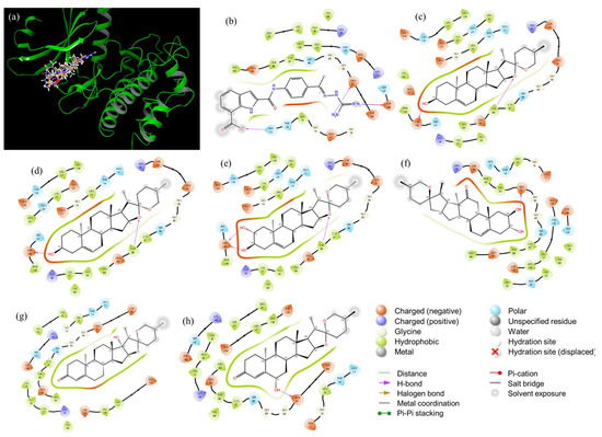 In Figure 6a, the 3D interaction of the potential inhibitors with CHK2 can be detected, highlighting that all inhibitors reach the enzymatic catalytic site. The 2D diagrams in Figure 6 show the interactions of the amino acid residues of the catalytic site with the possible inhibitors. The hydrophobic region is latent in all the inhibitors, in a similar way that happens with CHK1; the polar, negatively charged, and positively charged regions can be observed. Hydrogen bonds are generated due to the presence of some oxygen atoms of the spiroacetal or substituted hydroxyl groups in different positions and amino acid residues of the catalytic site. For example, in Figure 6c between 3αOH and Asp311; Figure 6d between 3αOH with Glu308, and the oxygen of the E ring with Lys245; in Figure 6e 3αOH with Asp 311; in Figure 6f 2αOH and 3αOH with Asp 311; in Figure 6g 3βOH with Lys245, and 6αOH with Met304; and Figure 6h 6αOH with Glu308. Unlike what was shown for the possible inhibitors for CHK1, for CHK2 none of the candidates fit completely within the catalytic site. In this case, the type of replacement in C-2 and C-3 is not relevant. Since it is placed outside the site, thus preventing the interaction by kinase. Finally, the amino acid residues around the spirostans are conserved (see Figure 6). That is the case for positively charged Lys224, negatively charged Asp311, Glu305, Glu308, and polar Thr225, Ser228, Gln358. These interactions are also present in the reference drug (PD407824), so it is important to point them out, thus finding the key amino acids in the catalytic site (see supplementary material). The first two are expected to have a specific inhibition and the third a dual inhibition for CHK1 and CHK2.