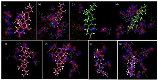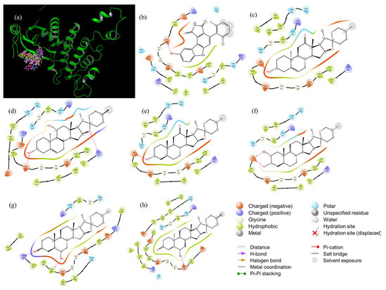 Interaction diagram for CHK1 (catalytic site) for: (a) 3d Superposition; (b) CCT241533; (c) Sp1 (diosgenin); (d) Sp3; (e) Sp24; (f) Sp97; (g) Sp154; and (h) Sp137.