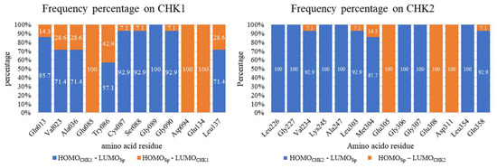 It is well known that attractive interactions are all important for any rational approach to drug design. The key amino acids of catalytic site present intermolecular interactions with potential inhibitors; however, given the position, the formation of non-bonding HOMO-LUMO stabilizing interactions from the protein to the ligand and vice versa were found. The assessment of the HOMO and LUMO orbital interactions at the catalytic site and the spirostans, for each CHK, showed a trend that favors the interactions of the HOMO of the protein to the LUMO of the Sp (Figure 7), except at the Glu and Asp residues in both cases, denoting that in both enzymes its site is highly conserved. Particularly for CHK1, only in Gly89, there was a 100% frequency where the same gap predominates; in the other residues of the site, at least one molecule inverted the direction of the gap, particularly for the dual inhibitor Sp137 (Table 4). In contrast, for CHK2, in residues Leu226, Gly227, Lys245, Ala247, Glu306, Gly307, and Leu354, the gap from HOMOCHK2 to LUMOSp predominated in most of the residues of the site, with only a Sp of the gap (Sp137) in the rest, except for Met304, which was two Sp. This indicates that for a dual inhibition the gap of the Sp towards the protein must predominate, while for selective inhibitors (Table 4) the gap direction is inverted.