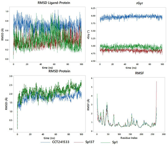 Molecular dynamics studies for CCT241533, Sp137, and Sp1 in CHK1: RMSD of ligand–protein, RMSD protein, and rGry.