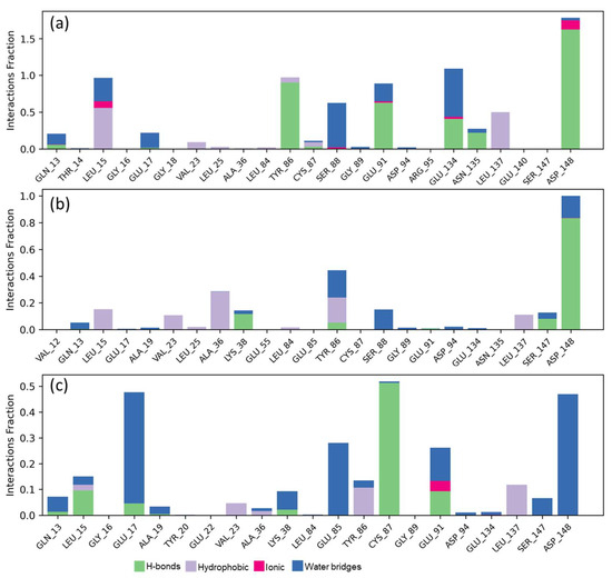 In terms of contacts with the key amino acids that were discussed above (Figure 10), we can denote that they behave differently between Sp1 and Sp137, as well as the reference inhibitor (CCT241533), conceiving high interactions with Asp148, by the spirostans with Tyr86. The increase in Sp137 is associated with Gly17, Glu85, and Cys87. In Figure S1 can be observed the contacts and their stability, as well as the RMSF per ligand, SASA, PSA, torsions, and contacts as a function of time. In addition to this, the coupling energy was determined through an MM-GBSA approach, finding for CCT241533 a ΔGBinding= −48.153 kcal/mol (−47.9 to −49.6), while for Sp137, ΔGBinding= −58.378 kcal/mol (−57.2 to −58.9), and for, Sp1 ΔGBinding= −53.863 kcal/mol (−53.2 to −54.3), as an average with respect to the stability of the complex, denoting the same relationship as that obtained in the docking score with respect to the strength of CHK1 inhibition.