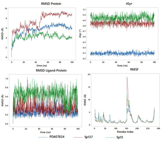 A stable enzyme-inhibitor complex exists, differently than on CHK2 (Figure 11); however, the protein produces many fluctuations on the RMSD, generating an inhibitory effect. We can observe that Sp137 and Sp13 are above and below, respectively, the reference inhibitor (PD407824); in terms of stability, it takes 10 ns to reach the same level for PD407824 and Sp13. Sp137 at 5 ns stabilizes at 5.2 Å for the RMSD, but not until 60 ns does it finally stabilize at 8.1 Å. For rGyr, unlike that observed in CHK1, there is a greater effect on the part of the Sp, with average values of 4.85 Å and 4.95 Å for Sp137 and Sp13, respectively, while for PD407824, the average value is 4.31 Å. Finally, the RMSF, it is at the center of the protein where the greatest effect is generated, and this is a result of the coupling on the outside of the protein, generating its collapse. In terms of inhibition, the high modification of the protein represents an inhibitory effect on it, given that the enzyme–inhibitor complex is stable; however, the protein is affected by said coupling.