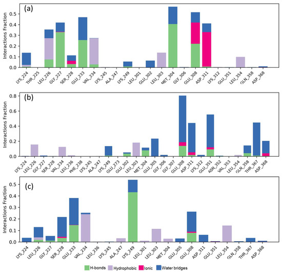 Finally, the contact analysis with the key amino acids (Figure 12) denotes a highly polar behavior on the part of the active site and therefore the highest coupling energy of molecules, conserving Glu308 with high interactions on Sp137, Sp13, and CCT241533. Particularly, per molecule, high contacts were presented for each one, being Leu226, Gly227 Met304, and Asp311 for the CCT241533, while for Sp13 it was Asp311, Gly351, and Thr367, showing a more polar trend which increased the coupling energy. However, on the part of Sp137, the same amino acids were highlighted as in the CCT241533 except for Asp311, which indicates a similar behavior only with greater strength due to the bridges with water that are preferentially formed. Studies of RMSF as a function of the SASA ligand, PSA, torsion, and time function contacts can be seen in the supplementary material (Figure S2). Finally, the MM-GBSA calculations found for PD407824 a ΔGBinding= −51.871 kcal/mol (−51.7 to −52.3), while for Sp137, ΔGBinding = −59.912 kcal/mol (−59.6 to −60.1) and for Sp13, ΔGBinding = −54.287 kcal/mol (−53.9 to −54.7). The values were slightly higher in the CCT241533 and in Sp137 than those observed in CHK1; this, combined with the larger contact area found for the couplings with CHK2 vs. CHK1, shows the same trend as in the docking score.