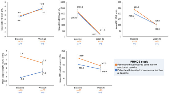 Mean haematological parameters over time for pegcetacoplan-treated PNH patients with and without impaired bone marrow function in the PRINCE study. Patient numbers at week 26 are as follows in the group of patients with impaired bone marrow function at baseline: haemoglobin, LDH, ARC, platelets, neutrophils, 5 patients each. Patient numbers at week 26 are as follows in the group of patients without impaired bone marrow function at baseline: haemoglobin, 24 patients; LDH, 24 patients; ARC, 21 patients; platelets, 25 patients; neutrophils, 20 patients. ARC, absolute reticulocyte count; Hb, haemoglobin; LDH, lactate dehydrogenase; SE, standard error.