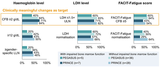 Proportion of pegcetacoplan-treated PNH patients with and without impaired bone marrow function reaching clinically meaningful treatment outcomes vs. normalisation. CFB, change from baseline; FACIT, Functional Assessment of Chronic Illness Therapy; LDH, lactate dehydrogenase; LLN, lower limit of normal; ULN, upper limit of normal.
