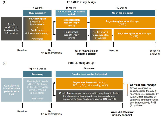 (A) PEGASUS [14,15] and (B) PRINCE [11] study designs. * Pegcetacoplan run-in periods in PEGASUS: (1) before randomisation, for both treatment groups; and (2) at start of open-label period, for the patients randomised to the eculizumab monotherapy group during the randomised controlled period. † Haemoglobin levels: LLN males, <13.6 g/dL; LLN females, <12.0 g/dL; LDH, 1.5 × ULN ≥339 U/L. ‡ All patients screened in PRINCE had never received a complement inhibitor at any point. C5i, complement 5 inhibitor; LDH, lactate dehydrogenase; LLN, lower limit of normal; PNH, paroxysmal nocturnal haemoglobinuria; SC, subcutaneous; ULN, upper limit of normal.