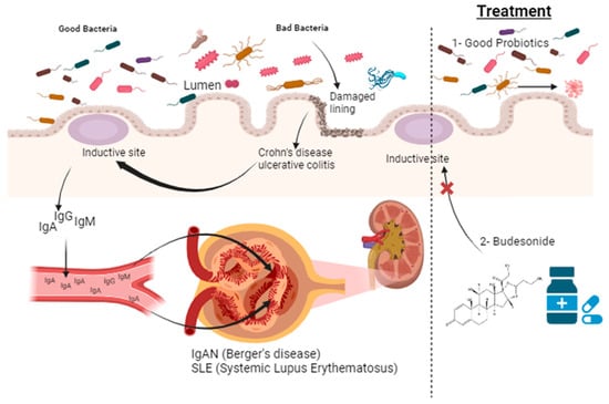 IgA nephropathy (IgAN) is a chronic kidney disease characterized by the deposition of IgA antibodies in the glomeruli, leading to inflammation and progressive renal damage []. The exact etiology of IgAN is not fully understood, but recent research suggests that the gut microbiota may play a significant role []. Accordingly, a major hypothesis is that aberrant immune responses to gut mucosal antigens might foster the production of an IgA variant that, when released in the bloodstream, is entrapped among the mesangial cells of the kidney glomeruli. Obviously, this hypothesis supports the view of a change in the gut microbiota as a major contribution to the stimulation of the gut immune system (see Figure 1) [].