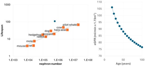Left: Relationship between number of glomeruli and maximum lifespan. The blue dot represents Homo sapiens. Right: Graphical representation of the MDRD formula reported in the text, with theoretical relationship between age and eGFR (the constant value of the formula has been fixed considering a male Caucasian subject and a constant creatinine of 0.96). The number of glomeruli in different mammals has been derived from [,]. The lifespans of different mammals have been derived from [] and from the AnAge database (http://genomics.senescence.info/species/ accessed on 10 June 2007) and the database from [] (https://www.demogr.mpg.de/longevityrecords/0203.htm accessed on 10 June 2023).