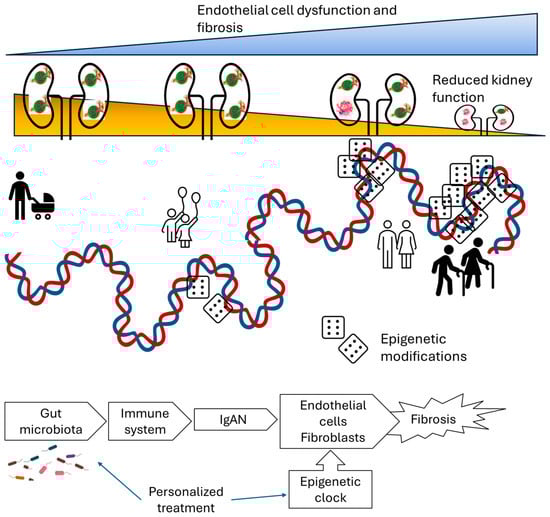 Epigenetic clock and kidney disease in personalized medicine. Upper panel: The epigenetic landscape of DNA is correlated with the human ageing process, and therefore with the individual variability in kidney diseases such as IgAN. It is possible that the ageing of endothelial cells mediates this relationship. Lower panel: Overall hypothesis regarding the microbiota and epigenetic clock control of kidney disease variability. Gut dysbiosis may represent a relevant trigger for kidney diseases such as IgAN. The epigenetic clock represents a modulator of endothelial and fibroblast responses to the immune trigger. A personalized medicine approach based on microbiome and epigenome data might result in a personalized treatment strategy.