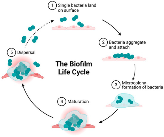 Schematic showing the growth cycle of a biofilm formed by a single bacterial species on a solid surface. (1) Reversible attachment of single planktonic bacteria to the surface. The first attach-ment of bacteria is influenced by attractive or repulsive forces generated by nutrient levels, pH, and surface temperature. (2) Aggregation of bacteria and irreversible attachment to surfaces. (3) Formation of an external matrix of multilayered complex biomolecules, microcolony formation, and EPS secretion that constitute the external matrix. Secretion of polysaccharides by biofilm-forming strains enables aggregation, adherence, and surface tolerance, allowing for improved surface colonization. (4) Maturation of biofilms and acquisition of a three-dimensional structure as they reach maturity. These three-dimensional structures rest on self-produced extra-cellular matrix components. (5) Fully mature biofilms detach, which allows bacterial cells to take on a planktonic state once again, thereby establishing biofilms in other locations (reprinted from [20]).