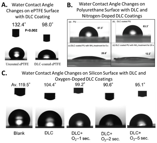 Examples of water contact angle (free surface energy) control with DLC. (A) Water contact angle changes on ePTFE surface with DLC coating (reprinted from [5]) (B); water contact angle changes on polyurethane surface with DLC and nitrogen-doped DLC coatings (reprinted from [13]) (C); water contact angle changes on silicon surface with DLC and oxygen-doped DLC coatings (reprinted from [11]).