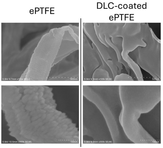 Surface smoothing of fibrous ePTFE structures using DLC coating. Application of DLC on the ePTFE surface clearly results in smoothing of each individual fiber within the fibrous structure of the ePTFE.