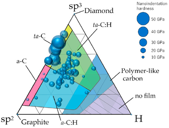 The distribution of 74 types of amorphous carbon films on a ternary diagram based on sp2 bonds, sp3 bonds, and hydrogen content. The diameter of each circle corresponds to the nanoindentation hardness of each amorphous carbon film. (Reprinted from [31]).