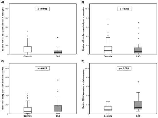 As shown in Figure 1A, the level of miR-33a-5p in monocytes was significantly lower in the CAD group compared with the CG [median: 4.09 (min. 0.30–max. 15.98) vs. median: 9.43 (min. 0.61–max. 50.75); p < 0.001, respectively]. miR-144-3p did not present significant differences between both groups (CAD and CG, respectively) [median: 5.61 (min. 0.21–max. 70.00) vs. median: 7.95 (min. 0.41–max. 77.53); p = 0.806] (Figure 1B). Conversely, miR-26a-5p was significantly higher in the CAD group compared with the CG [median: 10.63 (min. 0.41–max. 52.65) vs. median: 5.26 (min. 0.23–max. 43.94); p = 0.027, respectively] (Figure 1C). ABCA1 mRNA expression in monocytes was significantly higher in the CAD group compared to the CG (median: 13.82 (min. 5.69–max. 47.08) vs. median: 9.84 (min. 1.44–max. 26.85); p = 0.003) (Figure 1D).