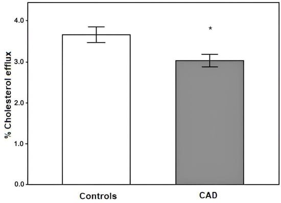 Cholesterol efflux from study groups; * p = 0.013. The data are expressed as means ± SE.